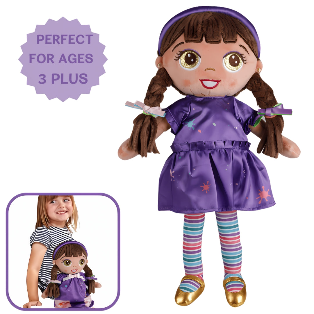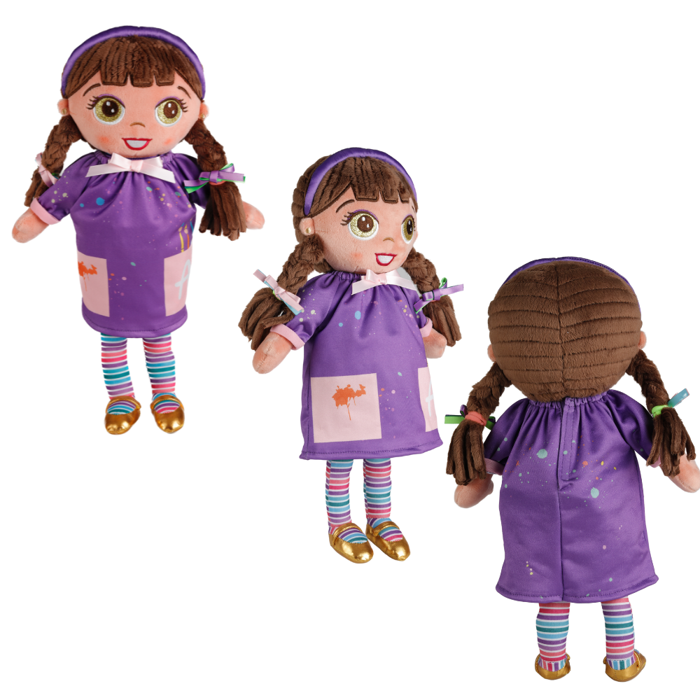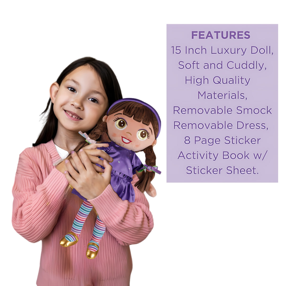 - INCLUDES: 15" Plush Doll with Removable Smock, Removable Dress, and 8 Page Sticker Activity Book w/ Sticker Sheet.