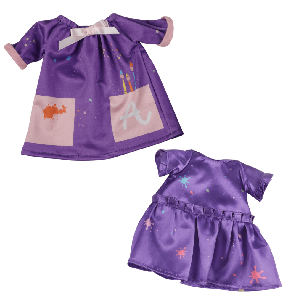 - PREMIUM FEATURES: Large Glittery Eyes, Artists smock with printed paintbrush pockets, Gorgeous satin dress, Shimmering Gold Lamé Mary Jane Shoes, Ultra soft hair with satin hairband.