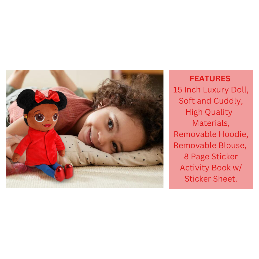 - INCLUDES: 15" Plush Doll, Removable Jacket, Removable Blouse, and Sticker Activity Book w/ Sticker Sheet.