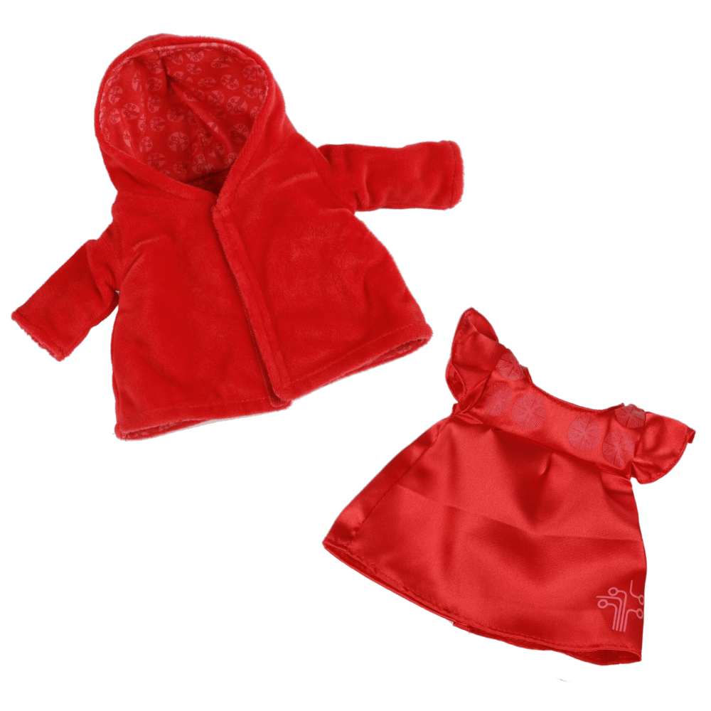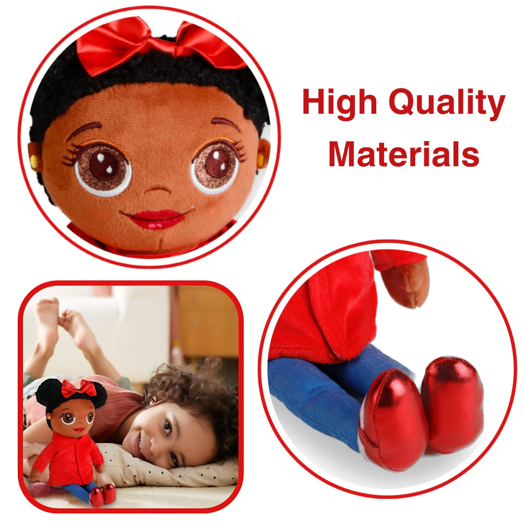 - PREMIUM FEATURES: Beautiful Large Glittering Eyes, Ultra Soft Jacket with Printed Inner Lining, Shimmering Red Lamé Mary Jane Shoes, Satin-feel blouse, Soft Touch hair with red Satin-feel hair bow.